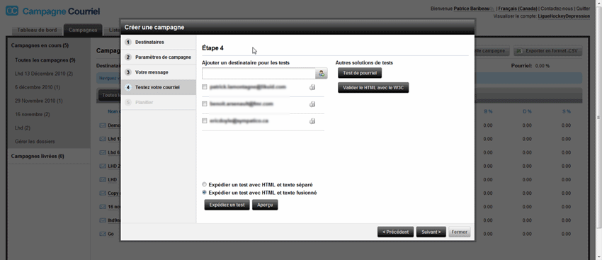 Simulation d'envoi à un ou plusieurs courriels "Test".